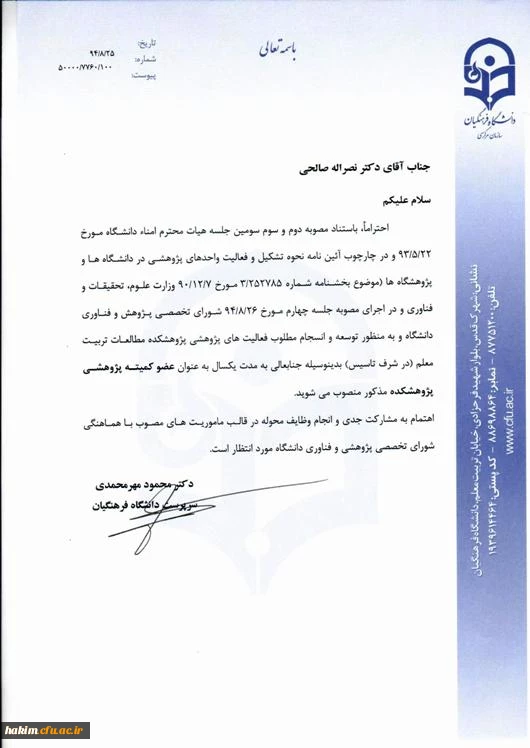 امتیاز دهید : انتصاب دکتر صالحی به عنوان عضو کمیته پژوهشی پژوهشکده مطالعات تربیت معلم 2 دوشنبه 16 آذر 1394 ساعت 9:11