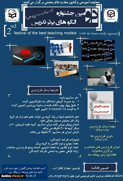 امتیاز دهید : برگزاری دومین جشنواره الگوهای برتر تدریس با رویکرد درس پژوهی 2 سهشنبه 25 اسفند 1394 ساعت 10:58