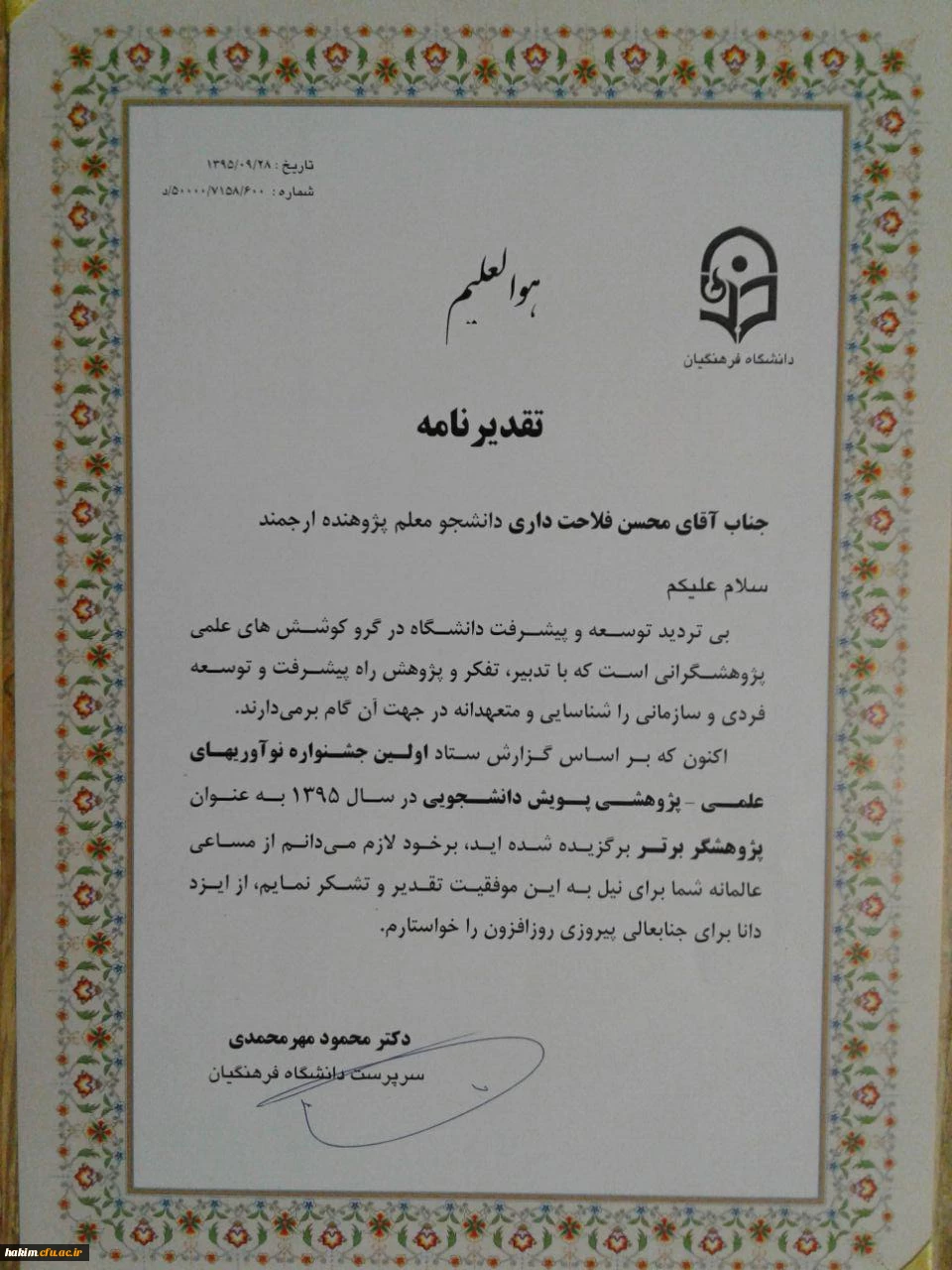 افتخار آفرینی آقای محسن فلاحتداری در نخستین جشنواره ملی نوآوری های علمی و پژوهشی دانشجو معلمان دانشگاه فرهنگیان 2