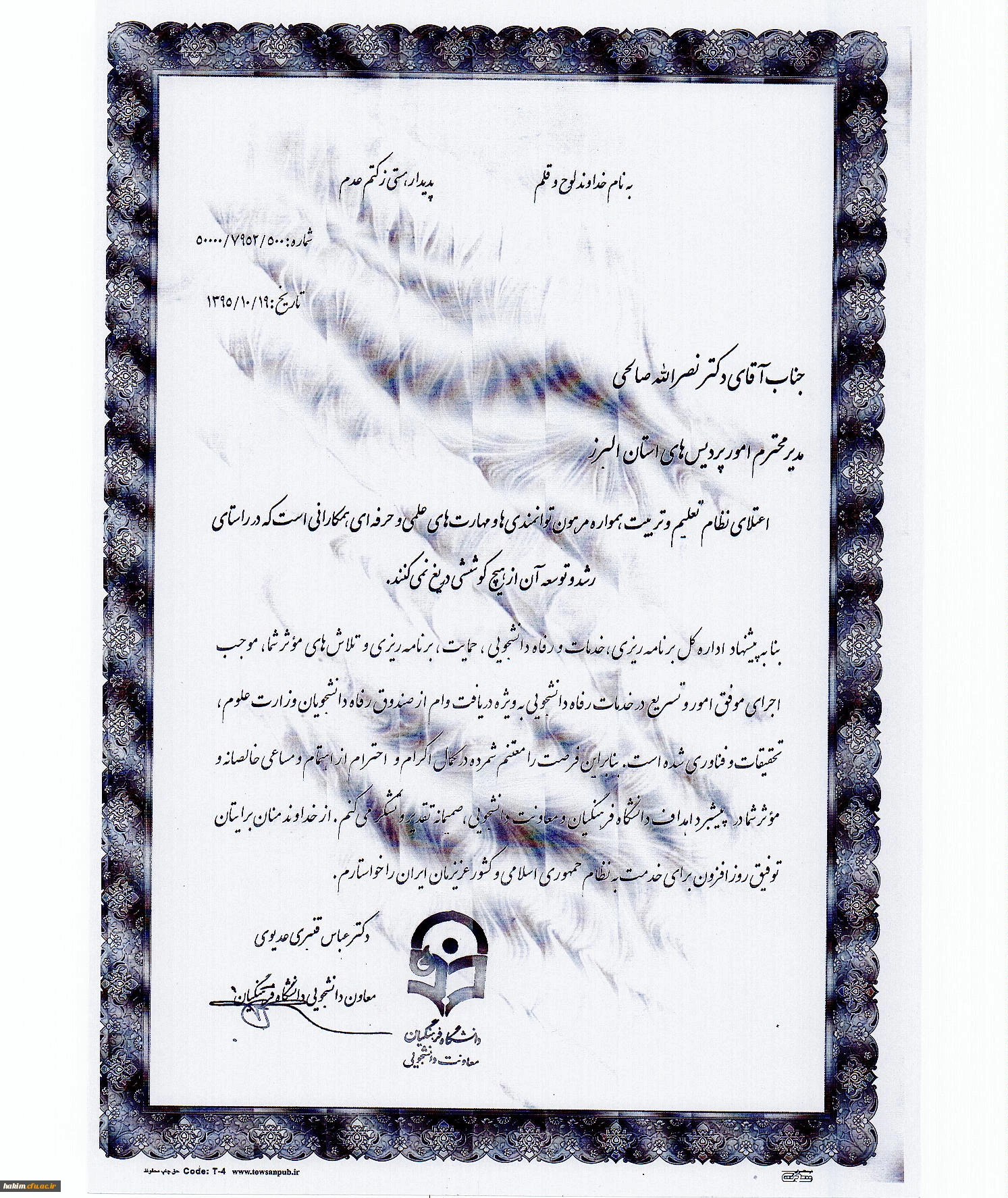 امتیاز دهید : تقدیر از سرپرست مدیریت امور استانی در اجرای موفق امور و تسریع در خدمات رفاه دانشجویی 2 یکشنبه 15 اسفند 1395 ساعت 13:38