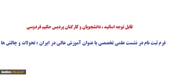 قابل توجه اساتید ، دانشجویان و کارکنان پردیس حکیم فردوسی: فرم ثبت نام در نشست علمی تخصصی با عنوان آموزش عالی در ایران : تحولات و چالش ها 2