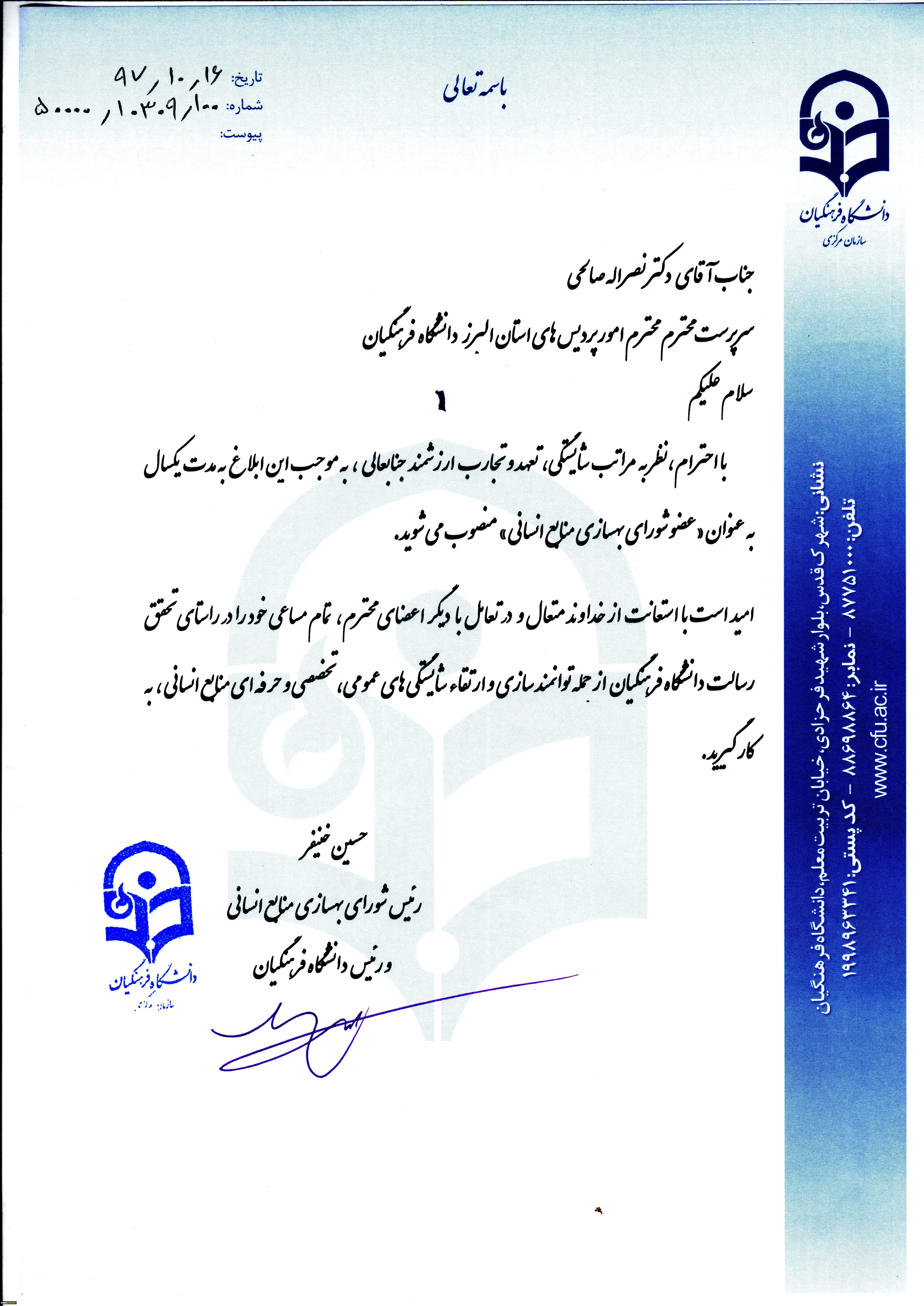 امتیاز دهید : ابلاغ عضویت دکتر صالحی در شورای بهسازی منابع انسانی دانشگاه فرهنگیان 2 یکشنبه 23 دی 1397 ساعت 7:57