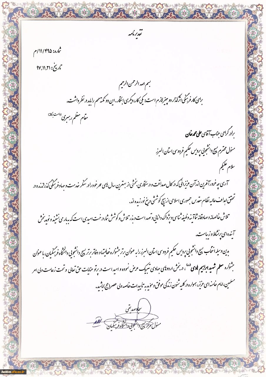 امتیاز دهید : کسب برترین پایگاه جهادی توسط بسیج دانشجویی پردیس حکیم فردوسی البرز 3 شنبه 4 اسفند 1397 ساعت 8:35