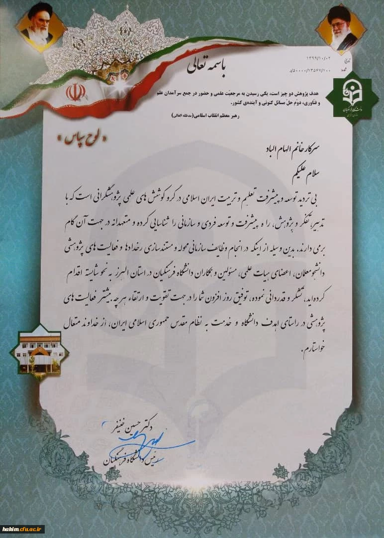 تقدیر جناب آقای دکتر خنیفر از کارشناس مسئول پژوهش پردیس حکیم فردوسی 2