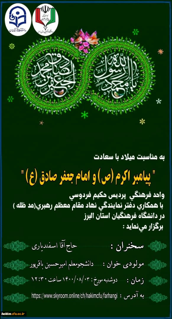 امتیاز دهید : مراسم گرامیداشت میلاد پیامبر اکرم(ص) و امام جعفر صادق (ع) 7 چهارشنبه 5 آبان 1400 ساعت 10:20