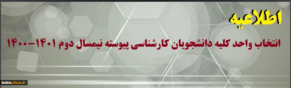 امتیاز دهید : انتخاب واحد کلیه دانشجویان کارشناسی پیوسته نیمسال دوم 1401-1400 2 جمعه 15 بهمن 1400 ساعت 0:51